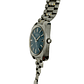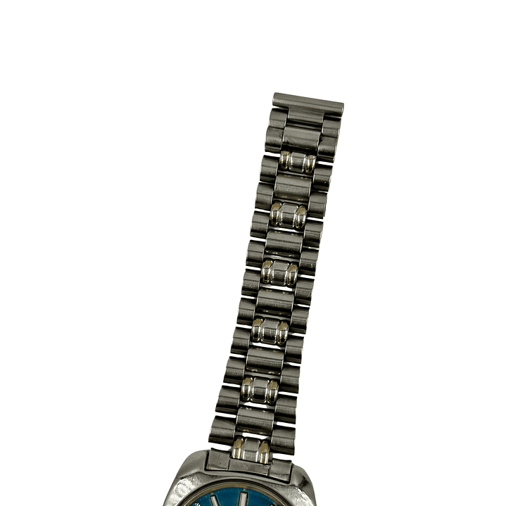 Este reloj es una escultura de su tiempo. La caja de acero inoxidable, con su característica forma de TV o "tonneau", tiene una presencia inconfundible en la muñeca. La verdadera protagonista es la esfera, de un hipnótico color azul verdoso que irradia luz desde el centro. Sobre ella, los índices aplicados, gruesos y facetados, añaden una increíble profundidad tridimensional. El reloj se completa con su brazalete de acero original, cuyos eslabones centrales en tono dorado aportan el toque de distinción definitivo.