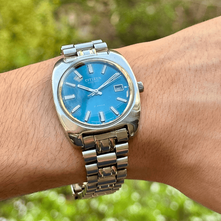 En el núcleo de esta pieza late un movimiento de la familia Citizen 6000. Este calibre automático de 21 joyas fue un verdadero caballo de batalla de la marca en los años 70, reconocido por su robustez, fiabilidad y eficiencia. Es un motor japonés diseñado para durar, y la razón por la que, casi medio siglo después, sigue funcionando con el mismo espíritu incansable.