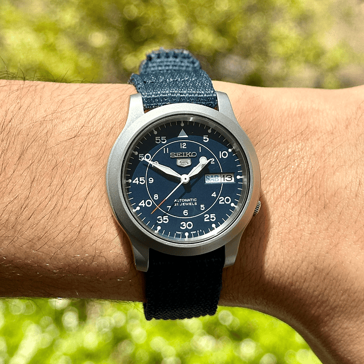 El SNK807K2 es un ejemplo de diseño funcional. Su caja de 37mm en acero inoxidable presenta un acabado mate (arenado o "bead-blasted") que evita los reflejos y le da un auténtico carácter de herramienta. La esfera azul, de inspiración militar, prioriza la legibilidad con una escala de minutos prominente. La corona, ubicada a las 4 en punto para mayor comodidad, es un sello distintivo de la línea. Se ajusta a la muñeca con una resistente y cómoda correa de nylon azul que completa su estética de reloj de campo.